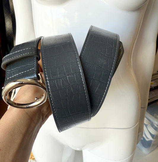 Oroton Navy Croc-Embossed Leather Belt – Silver Round Buckle
