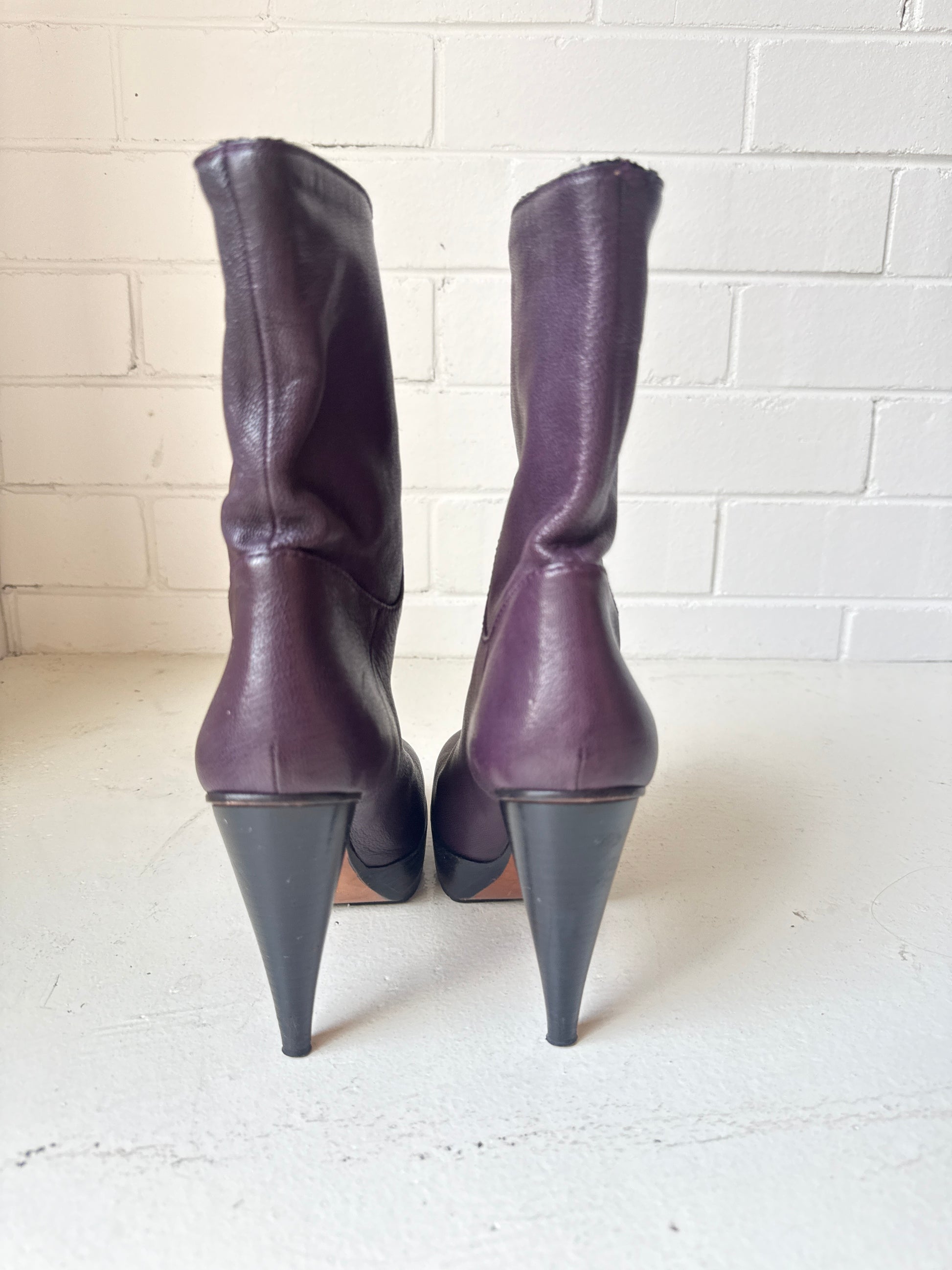 Step into Parisian sophistication with these Lanvin leather platform boots, a statement ankle boot that perfectly balances elegance and edge. Crafted from supple burgundy/plum leather, these boots are both bold and timeless.
