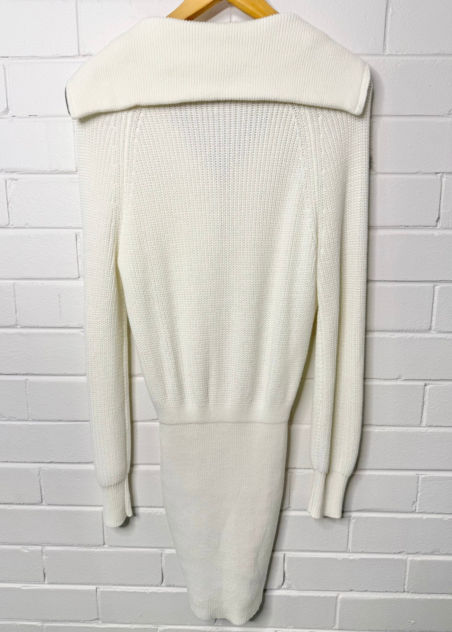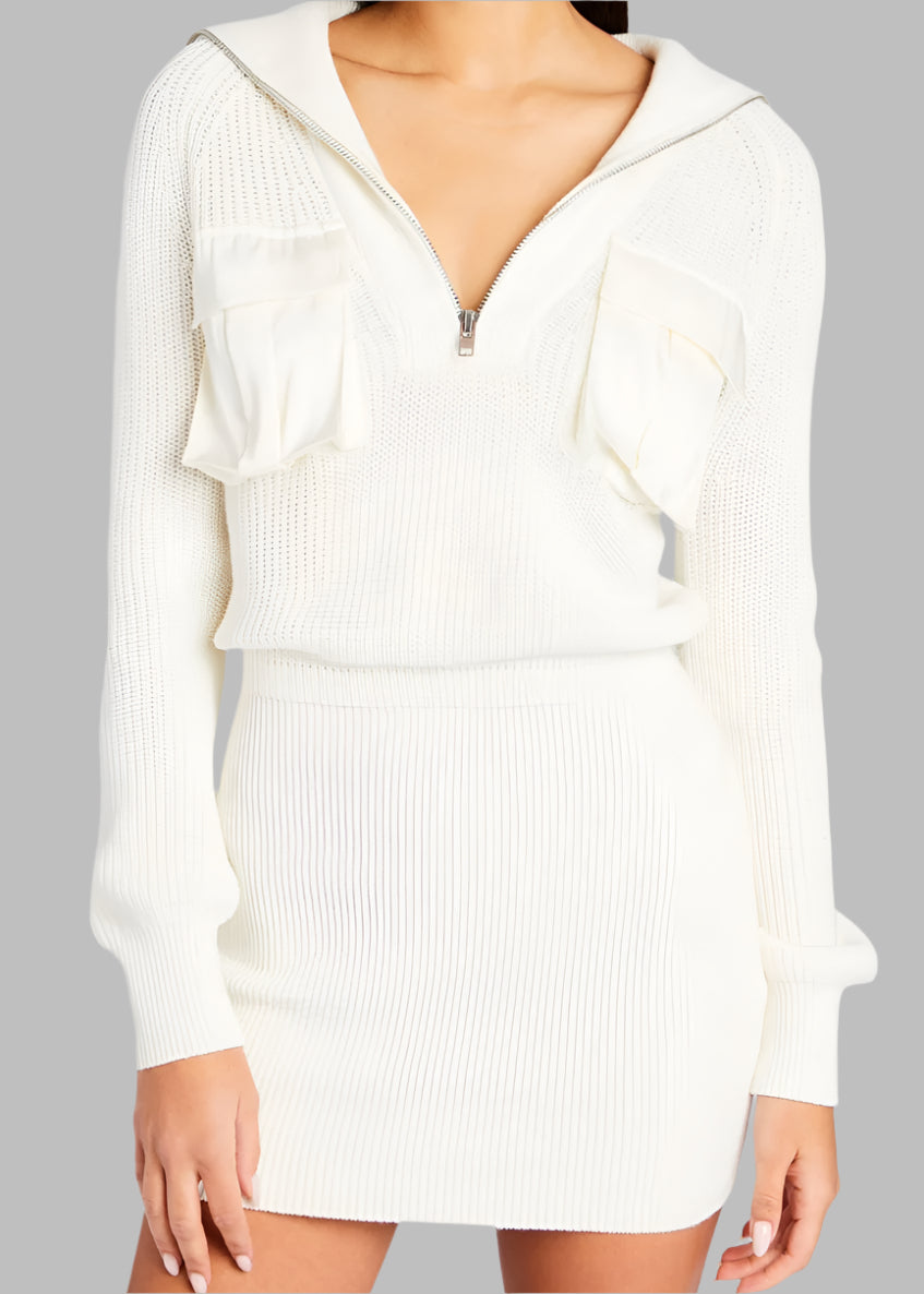 Knit mini dress in winter white with half zip neckline and two front pocket made of satin.