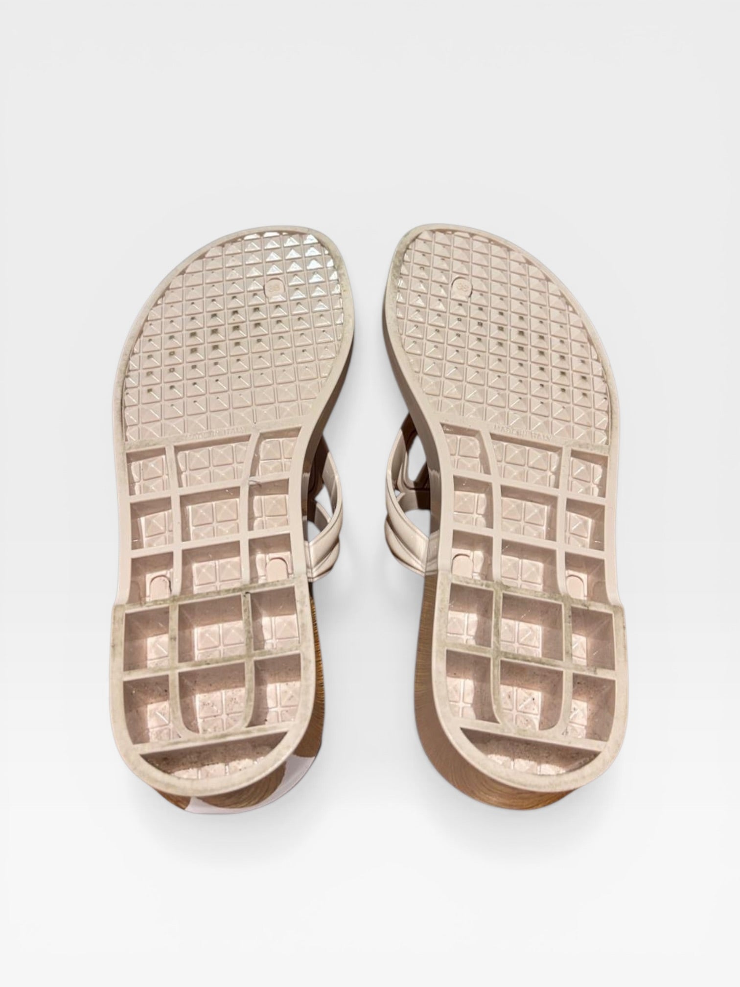 Crafted in glossy nude/blush rubber, they are lightweight, comfortable, and perfect for warm weather styling. The neutral tone makes them incredibly versatile — ideal for pairing with dresses, denim, or resort wear.