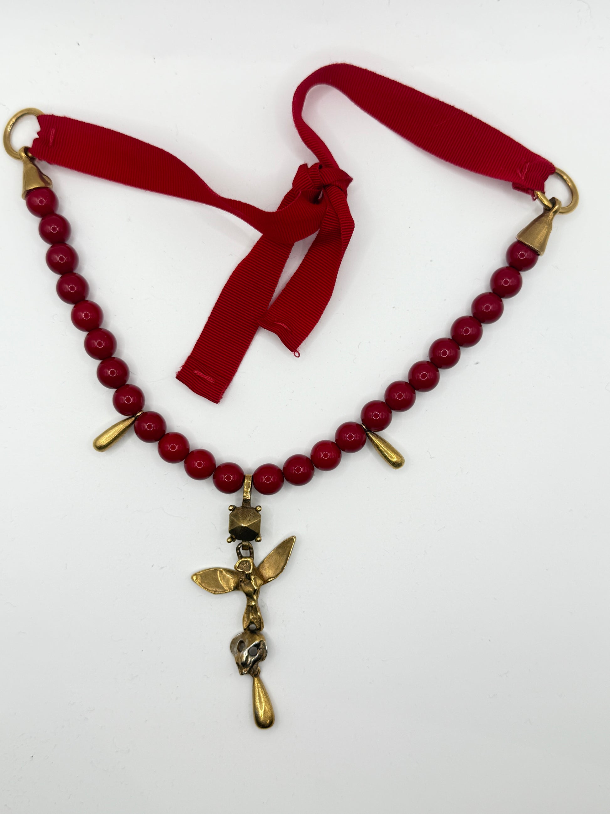 This rare design showcases a striking central pendant with an angel motif, a skull charm, and elongated teardrop drops, all suspended from a row of glossy red beads and finished with a red grosgrain ribbon tie. Artistic, edgy and unmistakably Valentino.